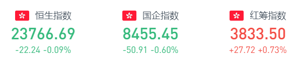 上周五,恒生指数微跌0.09%或22.24点,报23766.69点;国企指数下跌0.6%或50.91点,报8455.45点;红筹指数上涨0.73%或27.72点,报3833.50。