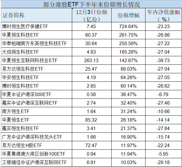 Wind统计显示,华夏恒生互联网科技业ETF份额由6月30日的108.43亿份激增至12月3日的263.13亿份,增幅达1.43倍。华泰柏瑞南方东英恒生科技ETF下半年以来份额增加2.51倍,华夏恒生科技ETF同期份额激增2.62倍,博时恒生医疗保健ETF5个月时间份额更是暴增7倍以上。