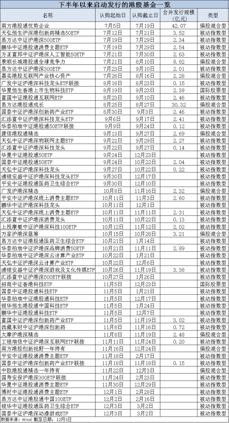 Wind数据显示,截至12月3日,下半年以来合计62只聚焦港股市场的基金启动认购,其中39只已经成立,合计募资超过140亿元,其余基金正在募集中。尤其四季度以来基金公司南下“掘金”的热情迅速升温,两个月时间内34只相关产品密集启动发行。