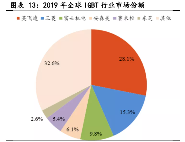 A股较知名的IGBT厂商有士兰微、华润微、斯达半导、捷捷微电、华虹半导体等IDM经营模式的半导体企业。全球IGBT的市场份额主要被英飞凌、安森美、三菱等巨头占领。