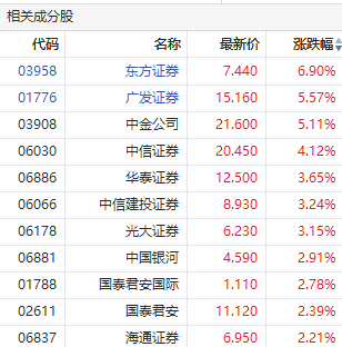 华盛资讯12月6日消息,中资券商股集体拉升,东方证券涨近7%,中金公司、广发证券涨超5%,中信证券涨超4%,中信建投证券、华泰证券涨超3%。