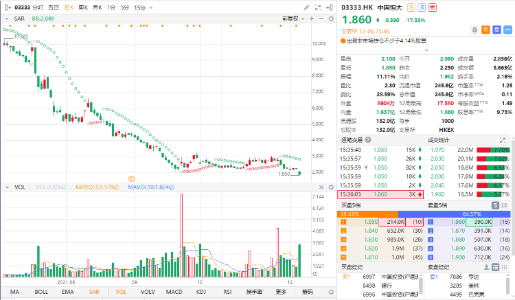 华盛资讯12月6日消息,中国恒大跌幅扩大至17.33%至1.86港元,股价创调整新低,成交额5.66亿港元,最新总市值245.6亿港元。