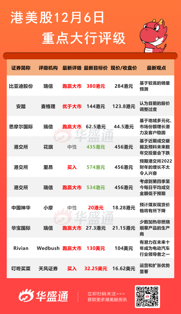 瑞信发布研究报告称,维持比亚迪股份“跑赢大市”评级,12月只需卖出5.9万辆车,即可达成全年70万辆销售目标,因此上调2021-23年每股盈测3.6-9.1%;另因较高的销量预测,目标价由350港元上调8.6%至380港元。