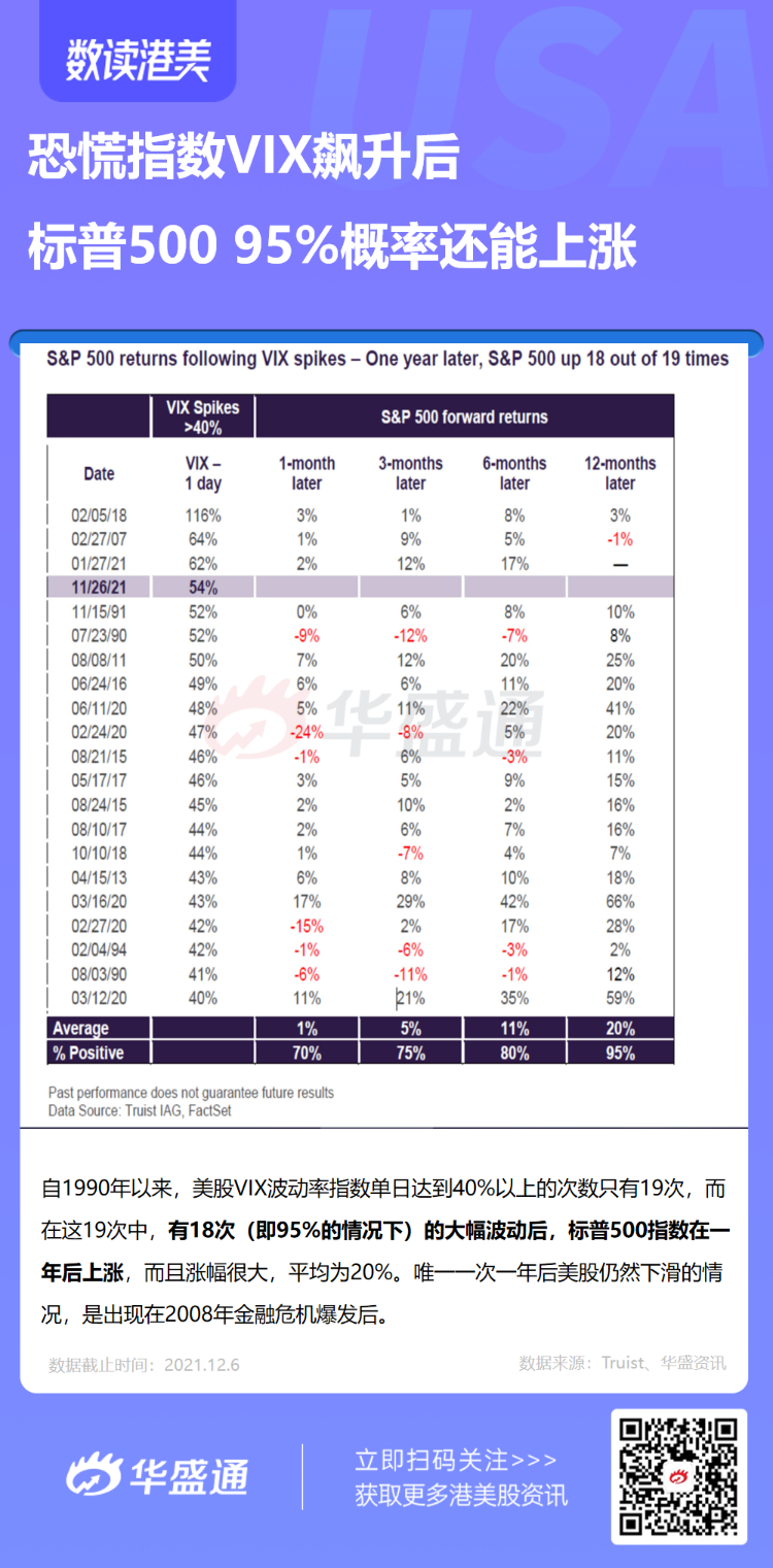 根据勒纳的统计,11月26日,VIX波动率指数(又称恐慌指数)飙升54%,这是过去30年来最大的5次单日波动之一。自1990年以来,VIX指数有19个交易日上涨了40%以上。在这19个交易日中,标普500指数一个月后上涨的概率高达70%;在一年后上涨概率更是达95%,而且涨幅平均为20%。