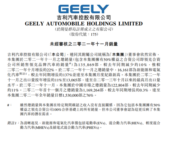 12月6日消息,吉利汽车在港交所公告,11月总销量为135,869部,同比减少约10%,环比增长约22%。11月新能源和电气化汽车销量1.6161万辆,较去年同期增长约137%并达至本集团月度纪录新高。