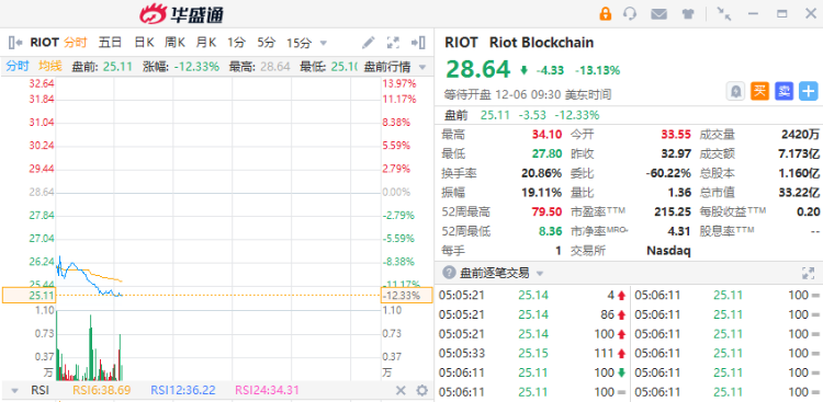 美股区块链概念股盘前走弱,Riot Blockchain(RIOT)跌12%,Coinbase(COIN)跌4.89%,嘉楠科技(CAN)跌3.80%。