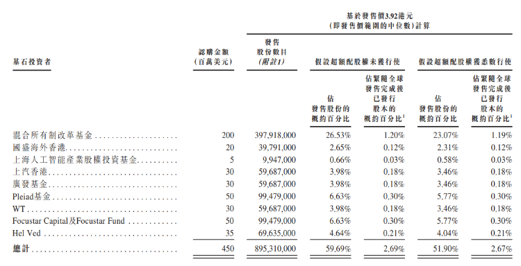 本次引入9名基石投资者,包括中国国有企业结构调整基金、国盛集团、上海人工智能产业投资基金、上汽集团、广发基金、Pleiad Funds、WT Funds、Focustar Fund及Hel Ved Capital,合共投资4.5亿美元,以招股价下限计占集资规模约60%。