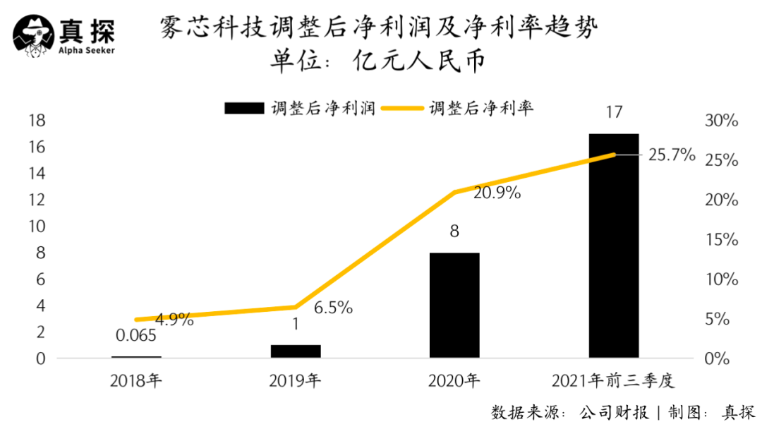 高速增长的同时,雾芯科技还保持着良好的盈利水平。根据财报,雾芯科技2021年第三季度调整后净利润为4.5亿元,整个2021年前三季度,其调整后净利润为17亿元,调整后净利率为25.7%,盈利能力较此前进一步提升。