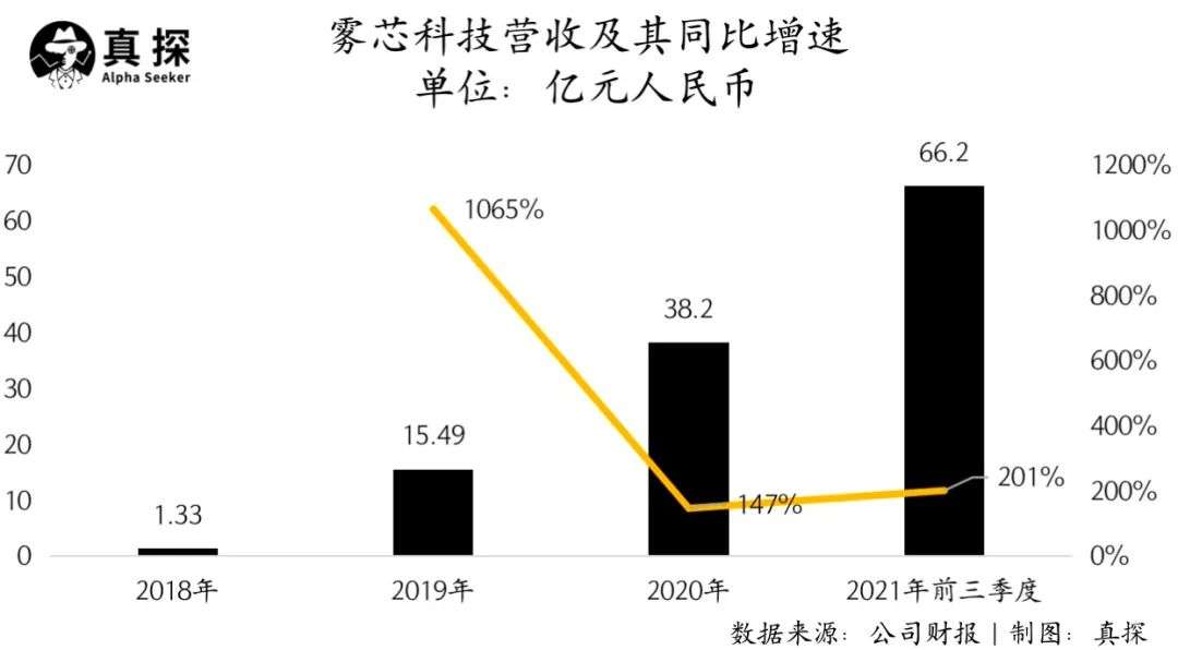根据财报,雾芯科技2021年第三季度营收为16.8亿元(若无说明,单位均为人民币),同比增长49.7%。而在整个2021年前三季度,雾芯科技实现营收66.2亿元,同比增长201%,依然处于高速增长阶段。
