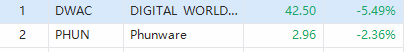 华盛资讯12月6日消息,特朗普概念股早盘跳水,数字世界收购集团(DWAC)回吐全部涨幅,此前一度涨超7%,现跌5.49%,公司受到美国证券交易委员会和美国金融业监管局的调查。Phunware(PHUN)跌超2%。