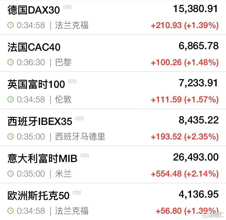 格隆汇12月7日丨德国DAX30指数涨1.39%,法国CAC40指数涨1.48%,英国富时100指数涨1.57%,西班牙IBEX35指数涨2.35%,意大利富时MIB指数涨2.14%,欧洲斯托克50指数涨1.39%。