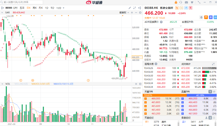 华盛资讯12月7日消息,香港交易所连续三个交易日累涨近8%,现涨超2%,报466.2港元,总市值超5911亿港元。