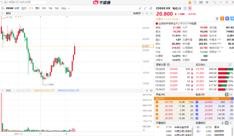 华盛资讯12月10日消息,今日早盘,海伦司拉升走高盘中涨超10%,截至发稿,涨8.11%,报20.8港元每股,成交额7459万港元,最新市值263.5亿港元,其股价四日累涨逾35%。