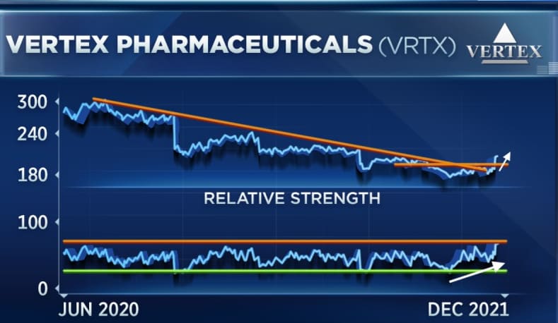 “第二个需要看的是一只近来不受关注的公司:Vertex。这是一只从下跌趋势扭转的股票,在我们看来,这只股票会持续走高,”Johnson说道。