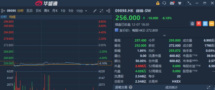 华盛资讯12月7日讯,社交媒体平台微博-SW $09898.HK 暗盘低开6.52%,尾盘收跌6.16%,一手账面浮亏336港元,最新总市值超600亿港元。该股预计将于明日(12.08)正式上市。