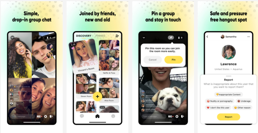 不同的是,Three-Group Video Chat 将一个名为“Pin”的功能独立为一个主页,即当用户成为房间里的 Speaker 并选择 pin 了该房间后,用户便可以在 Pinned 主页处更容易地遇见当时房间里的其他 Speaker 以及他们此刻正在参与的房间。