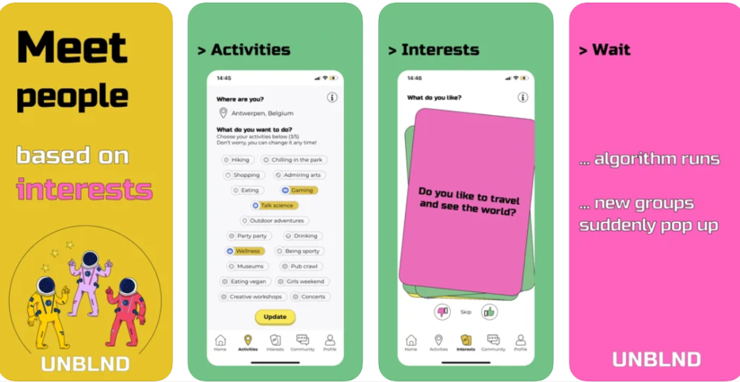 和一般的社交 App 以图会友不同,在互相关注或用户主动开放照片权限之前,用户没有权限查看对方的照片,UNBLND 认为这样的模式有助于帮助让用户真正专注在寻找志趣相投的朋友上,而不是被照片或虚假照片迷惑。UNBLND 的定位是让对“烹饪、旅行、语言、游戏”等方面有共同兴趣的人连接在一起。具体方法是: