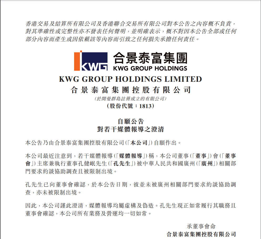 12月7日,合景泰富集团(01813.HK)在港交所发布澄清公告,公司最近注意到媒体报道称,公司董事会主席兼执行董事孔健岷被广州相关部门要求约谈协助调查且被限制出境。