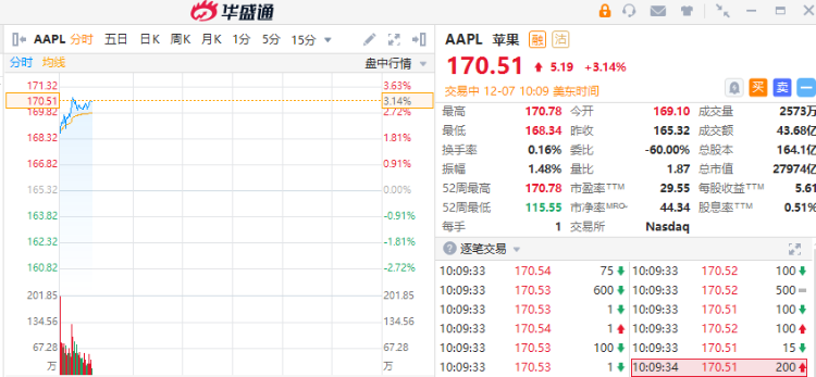 华盛资讯12月7日消息,纳斯达克、标普500指数涨幅扩大逾2%,美股明星科技股整体走高,苹果(AAPL)涨3.14%,最高触及170.78美元,再创新高;阿斯麦(ASML)、特斯拉(TSLA)、英伟达(NVDA)涨超4%,亚马逊(AMZN)、微软(MSFT)、谷歌(GOOGL)涨超2%,阿里巴巴(BABA)涨超1%。