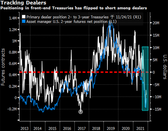 截至11月24日,一级交易商(主要是大银行)总体上是在做空2年期到3年期美国国债。他们的净空头头寸刚刚超过900万美元,接近2017年以来最看跌水平,表明为非指标国债提供关键流动性的买家回撤。