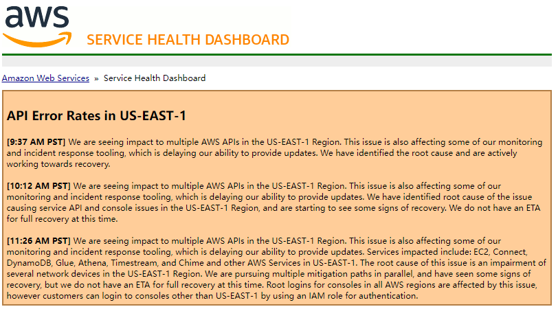 通知写道,“我们在US-EAST-1地区遇到了API和控制台问题。已经确定了根本原因,我们正在积极努力恢复。”