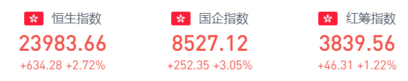 12月7日周二收盘,恒生指数大幅反弹上涨2.72%或634.28点,报23983.66;国企指数大幅上涨3.05%或252.35点,报8527.12;红筹指数上涨1.22%或46.31点,报3839.56。
