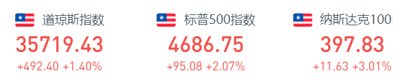 12月7日周二收盘,美股再度全面走高。其中道琼斯指数上涨1.4%或492.40点,报35719.43;标普500指数上涨2.07%或95.08点,报4686.75;纳斯达克指数大幅上涨3.03%或461.76点,报45686.92。