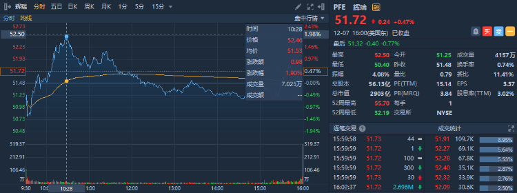 昨夜辉瑞盘中一度涨近2%,最终收涨0.47%,当前报51.72美元,总市值为2903亿美元。