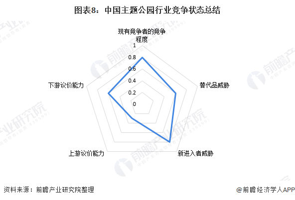 从五力竞争模型角度分析,由于目前,我国主题公园市场的竞争者较多,且各派系都处于稳步发展中,现有企业间的竞争较为激烈;随着消费文娱的快速增长,娱乐设施场地的增多,存在一定的替代品威胁;由于供应商数量较多,议价能力较弱;下游消费市场主要是终端客户,因主题公园品牌众多,消费者的选择很多,因此由较强的议价能力;此外,由于主题公园行业国外巨头纷纷布局中国市场,因此有较大的新进入者威胁。
