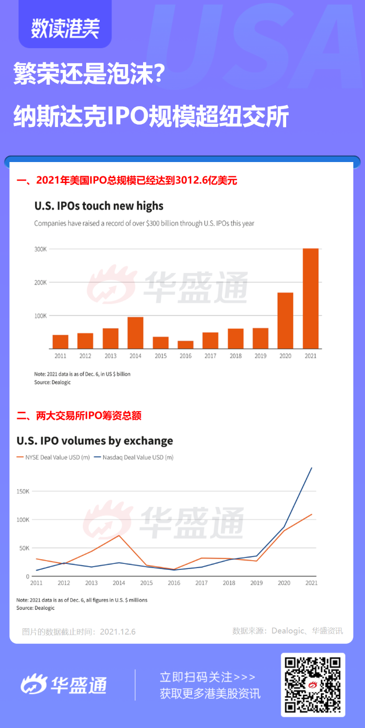 值得注意的是,不但美股首次公开募股(IPO)筹资金额创下纪录新高,纳斯达克的IPO的数量和规模规模比纽交所还要更胜一筹。