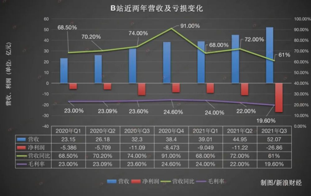 先看财报里披露的营收结构:B站第三季度营收达人民币52.07亿元,同比增长61%。净亏损为26.9亿元,同比扩大67%,环比更是扩大了88%。