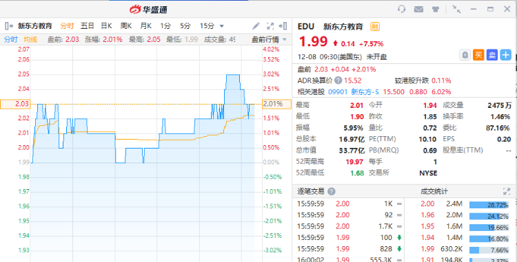 截至发稿,新东方美股盘前上涨2.01%,股价报2.03美元。