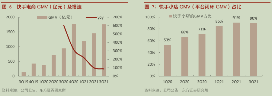 两个维度横向对比同行业水准:2020年抖音全年GMV在5000亿元上下,天猫直播在4000亿元左右,快手为3800亿元。在用户量明显小于抖音(近7亿MAU)和淘宝(7亿多MAU)的情况下,快手4亿多MAU已经非常接近淘宝直播的交易规模,说明其电商转化效率很好。