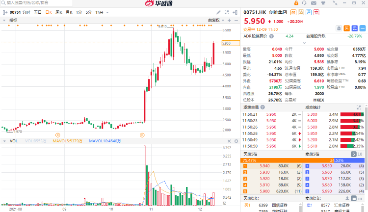 华盛资讯12月9日消息,创维集团早盘强势拉升,截至发稿,上涨20.2%,报5.95港元,成交4.77亿港元。