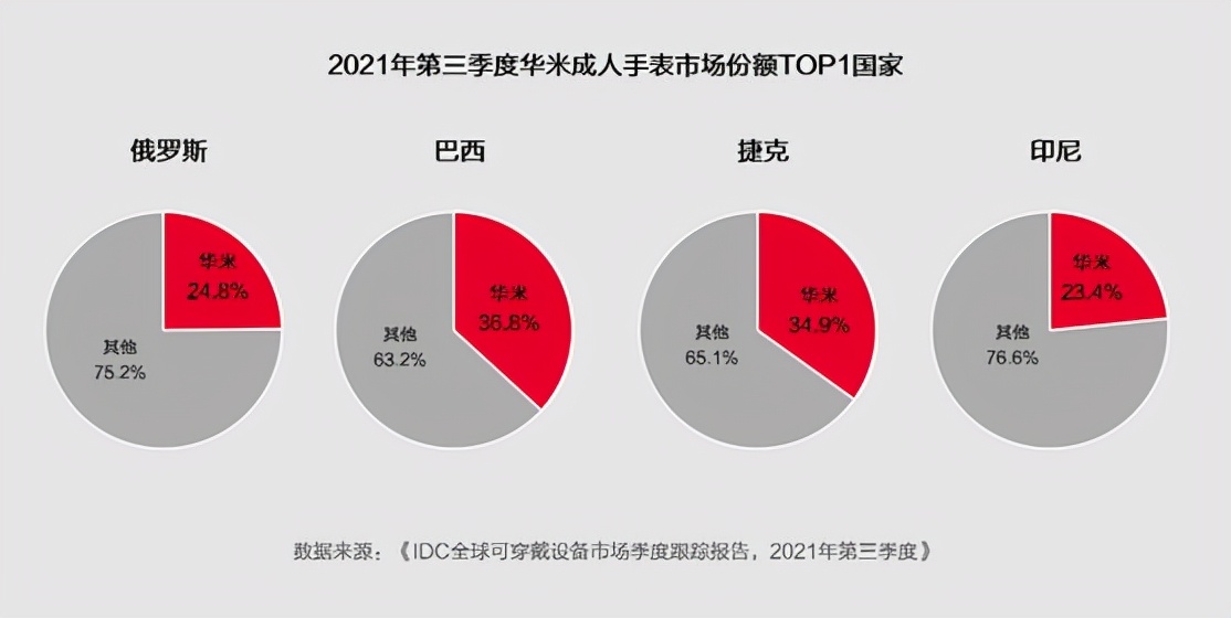 分区域看,在俄罗斯、巴西、印尼、捷克地区华米科技手表均取得了出货量排名市场第一的成绩,其中在巴西和捷克地区市场占有率超过了30%;在意大利、泰国、西班牙地区出货排名第二,市场份额均达到20%上下;此外,在墨西哥排第三。