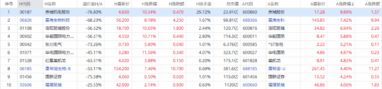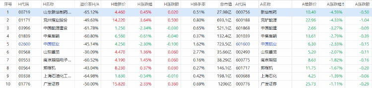 以A股收盘时间,AH股涨幅前10如下: