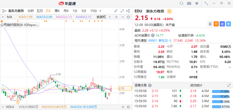 华盛资讯12月9日消息,今日美股盘前,中概在线教育股盘前走高,新东方(EDU)涨6.05%,高途(GOTU)涨5.79%,好未来(TAL)涨3.56%。