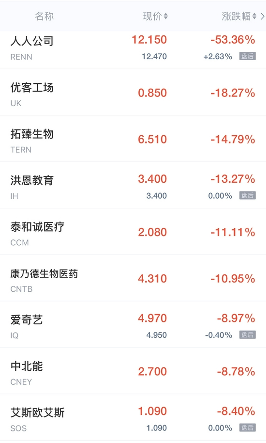 热门中概股周四收盘大多走低,人人公司暴跌超53%,盘中多次触发熔断,该公司高管以3亿美元和解Sofi股权案的提议遭法官驳回;部分教育股走高。