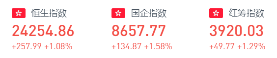 12月9日周四收盘,恒生指数上涨1.08%或257.99点,报24254.86;国企指数上涨1.58%或134.87点,报8657.77;红筹指数上涨1.29%或49.77点,报3920.03。