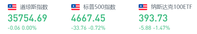 12月9日周四收盘,美股走势不一。道琼斯指数几乎收平,仅略微下跌0.06点,报35754.69;标普500指数下跌0.72%或33.76点,报4667.45;纳斯达克指数大幅下跌1.71%或269.62点,报15517.37。