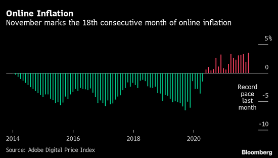 美国网上零售价格11月份同比上涨3.5%,创下了软件公司Adobe Inc.自2014年开始跟踪数字经济以来的最大涨幅。这一变动为连续第18个月上涨,是美国整体通胀水平的又一个缩影。电商曾经是折扣平台,在假日季尤为如此,但在经济从疫情之中复苏的当下已成了通胀稳定的来源。