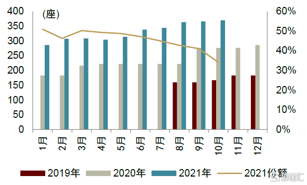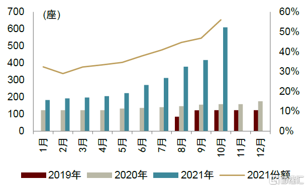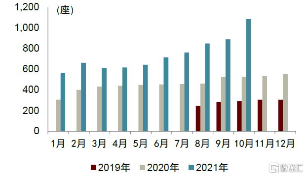 蔚来加快换电站布局,贡献行业主要增量。根据EVCIPA统计,截至2021年10月,纳入统计的三家换电运营商的换电站总量为1,086座,同比、较年初增加558/524座,从汽车保有量来看,单座换电站的平均服务车辆超过6,200辆,当前换电站建设仍处于早期阶段。