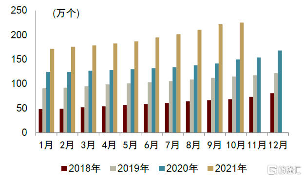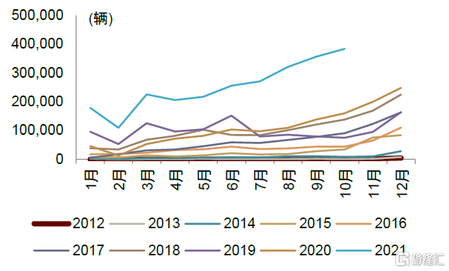2H20以来新能源汽车销量呈现快速增长态势。根据中汽协统计,1H20我国新能源汽车销量同比下降约41%,而2020年7月起恢复正增长且增速呈现扩大趋势,2H20销量同比增长65%,2020全年销量同比增长约10%。2021年我国新能源汽车销量保持快速增长态势,2021年1-10月累计销量达到254.2万辆,同比增长1.8倍。