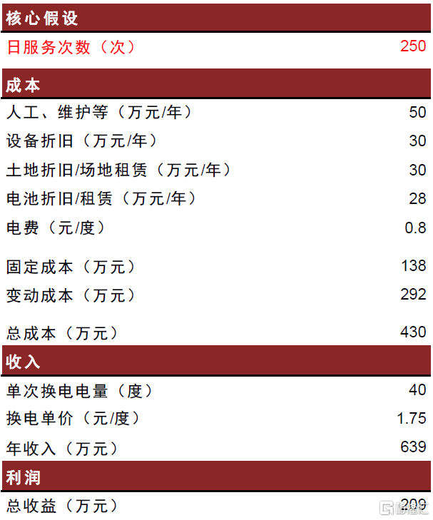 ►成本项:固定成本方面,假设土地折旧或土地租赁费用为30万元/年,设备等(换电设备、电力增容、EPC工程等)投资折旧为30万元/年,电池折旧或租赁费用为28万元(每块电池折旧1万元/年),人工、维保等费用50万元/年;变动成本方面,按照工商业平段电价0.8元/度计算(峰段约1.2元/度,谷段约0.3元/度。随着换电站运营算法优化,有望通过调节充电节奏降低平均电价成本)。