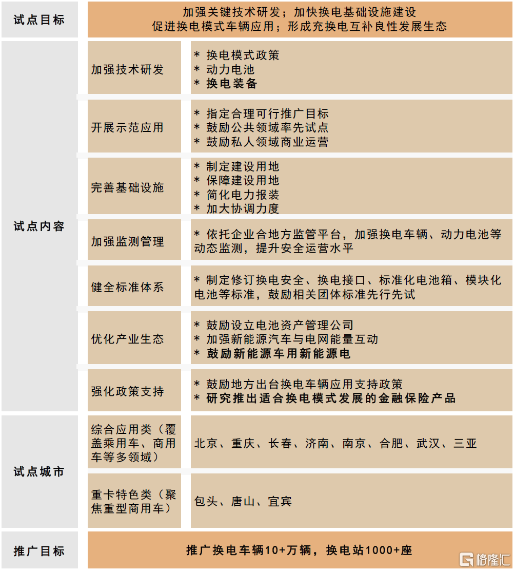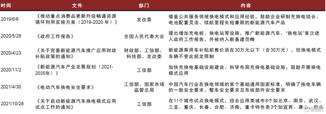 2021年10月28日,工信部发布《关于启动新能源汽车换电模式应用试点工作的通知》,拟在11座城市开展换电模式试点工作。其中,试点工作分为两类,一类为综合应用类,覆盖乘用车、商用车等领域,城市包括北京、重庆、长春、济南、南京、合肥、武汉、三亚;另一类为重卡特色类,聚焦重型商用车领域,城市包括包头、唐山、宜宾。政策预期目标为推广换电车辆超过10万辆,建设换电站超过1,000座。