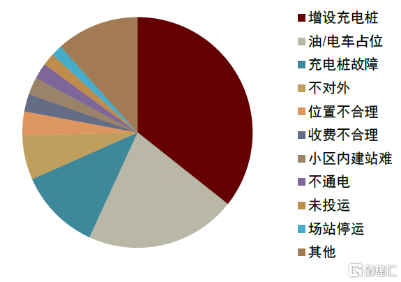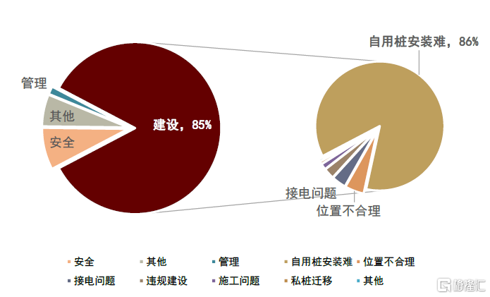 ►降低配电容量:随着新能源汽车保有量增加,部分地区特别是老旧小区出现了充电桩安装难等问题。我国各地住宅小区对居民区的供电配置容量基本按照建筑面积大小划定,如山东省为80㎡及以下每户4kW,81-120㎡每户6kW,120-150㎡每户8kW,150㎡以上每户12kW。一般的家用慢充充电桩功率为7kW(快充充电桩功率在30/60/120kW甚至更高),相当于一户住宅的配电容量。而老旧小区早期设计配电容量时未考虑对新能源车充电桩的大量预留,因此当小区内已有充电桩数量达到一定程度时,会出现配电容量不足的现象,进而限制新桩建设。解决这一问题,需要在早期设计阶段预留更多容量,或对小区进行电力增容改造,但会延伸出费用支出和支出义务归属等问题。由此,随着新能源汽车保有量和密度上升,私人桩建设瓶颈或逐渐显现,特别是一些大城市已经出现了类似矛盾,而此类场景需依托于公共桩建设或换电站建设来满足相应需求。例如从2020年北京市关于私人充电设施的舆情反馈来看[2],在1,647条舆情中,民众反映的主要是建设类问题(占85%),建设类问题中86%为自用桩安装难问题,约1,200条。
