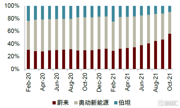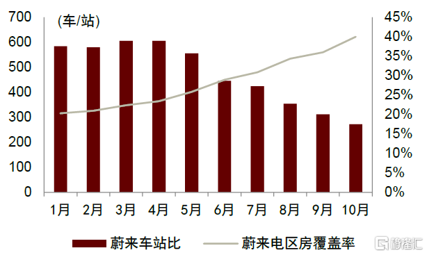 根据EVCIPA数据,截至2021年10月,蔚来建成换电站609座(蔚来官方披露数据为598座,二者相对接近),2021年1-10月贡献了三家换电站建设企业(蔚来、奥动、伯坦)中81%的换电站增量,保有量市场份额由年初的32%快速提升至56%。同时,根据蔚来统计,随着二代站投入和快速建设,蔚来换电站的车站比由2021年4月的606下降至10月的272,同时电区房(距离换电站3公里以内的住宅)覆盖率由年初的20%提升至10月的40%,蔚来目标2025年电区房覆盖率达到90%。