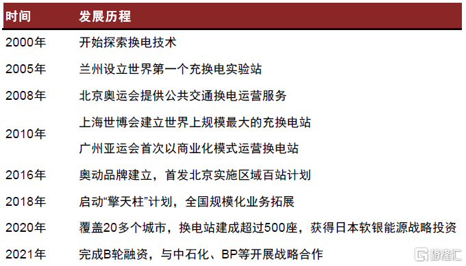 ►能源集团合作方面:2021年4月,奥动与中石化开展战略合作,将在全国超过3万座中石化加油站布局换电站;11月8日,英国石油公司BP与奥动新能源签署合资合作协议,拟在广州完成合资公司试点项目,为广州出租车、网约车和其他乘用车辆提供换电服务。