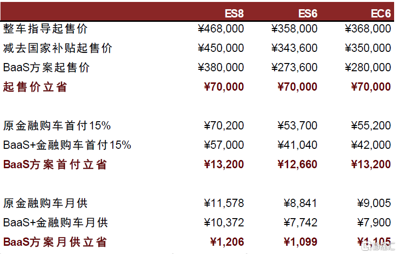 ►降低购车价格:换电模式实现了“车电分离”(消费者可购买不含电池的车体,通过租赁或其他方式获得电池)。例如2020年蔚来发布了BaaS(Battery as a service)商业服务,消费者可以以电池租赁的方式购买蔚来全系车型(支付电池月租费980元),而购车价格一次性降低7万元,降低了消费者初始购车压力。此外,BaaS服务为“可充可换可升级”,换电模式下,消费者可免费享受后续的电池容量和性能升级,而无需额外购买新款电池。