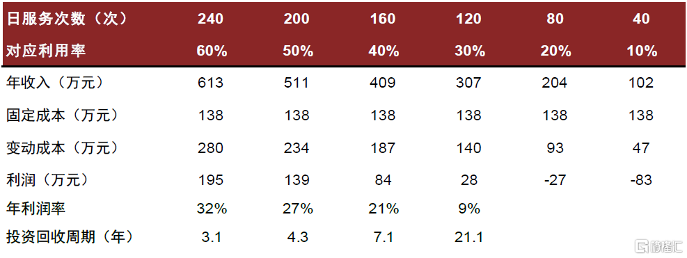►利润项:假设日服务次数达到实际峰值约250次,则对应年收入约639万元,总成本430万元,年度利润约209万元,利润率约32%,投资回收期约3年。